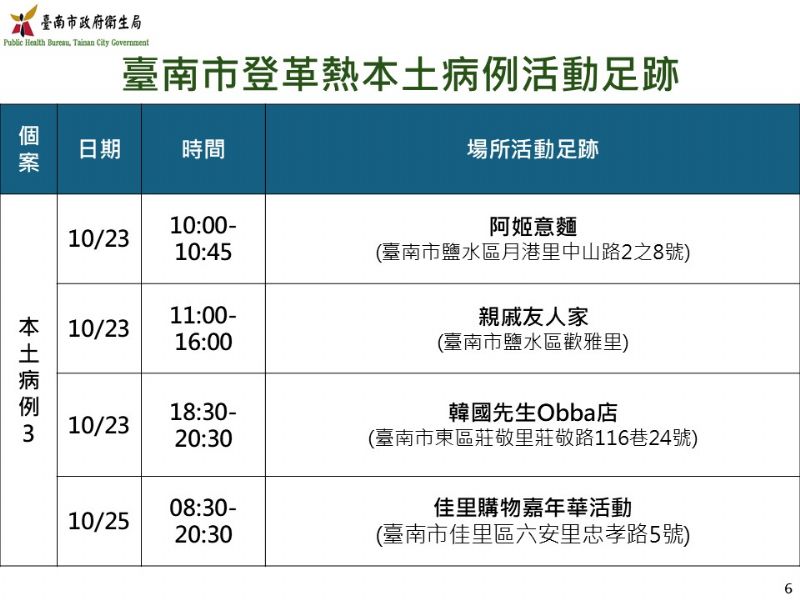 南市於今(114)年10月26日新增1例登革熱本土病例,疫情調查顯示為南區本土登革熱群聚之食品工廠員工,本案為該廠第三例,病毒型同為第三型;本案於10月21日擴大篩檢NS1及PC R檢驗均為陰性,10月25日監測期內出現發燒症狀,隨即主動回報公司與衛生所,之後至醫院就診,經醫師使用NS1快篩陽性而通報及住院治療中,後PCR陽性確診,病毒型別與前二案同為第三型。該案擴大採檢同時,衛生所衛教出現症狀應主動通報及就醫,以降低社區風險。該案於病毒血症期活動足跡有鹽水區、東區和佳里區(詳細地點如圖所示),市長黃偉哲籲請市民朋友,倘有與確診個案足跡重疊,且出現發燒等疑似登革熱症狀者,請盡速就醫。