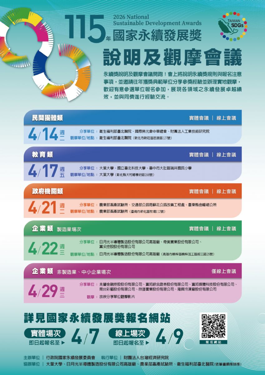 | 2026/3/30 | 115年國家永續發展獎選拔表揚計畫 |