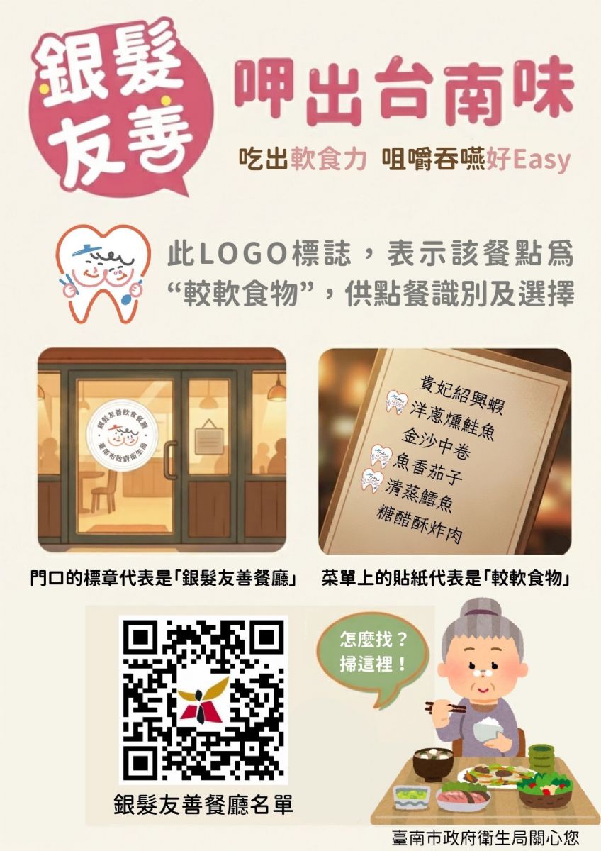 誠摯邀請市民朋友多加利用銀髮友善餐廳資源,透過線上回饋機制分享用餐經驗與建議,讓我們更貼近民眾需求,持續優化銀髮友善餐飲政策。「銀髮友善餐廳」名單請參考網址: https://p.tainan.gov.tw//zpBoY2 。