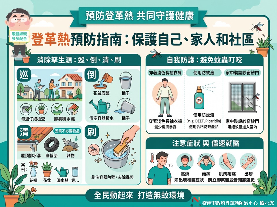 黃偉哲市長再次暖心呼籲市民朋友,當出國旅遊、工作及返鄉探親時,於出國前應先清除家戶內外環境孳生源,將容器妥善收拾避免積水;旅遊時,務必加強個人自主防蚊措施,穿著淺色長袖衣褲,皮膚裸露處使用政府機關核可,含敵避(DEET)、派卡瑞丁(picaridin)或伊默克(IR3535)成分的防蚊藥劑,並選擇有紗門、紗窗的房舍居住;返國後14日內,應密切留意自身健康情況,如有疑似症狀應儘速就醫切勿自行服藥,並主動向醫師說明近期旅遊地點、活動情形及接觸對象,以利醫師正確診斷、治療與通報。市民朋友想知道登革熱最新疫情資訊請參閱臺南市政府登革熱防治中心網頁https://gov.tw/zv9 或撥打06-3366366防疫專線。