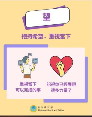 望:可接觸溫暖、關懷的訊息,對於未來抱持希望,面對變動也保持彈性,並設定可達成的短期目標,正向肯定未來方向。