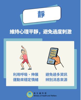 靜:透過深呼吸、伸展等方式穩定情緒,避免重複觀看或轉發緊張事件資訊造成心理刺激。