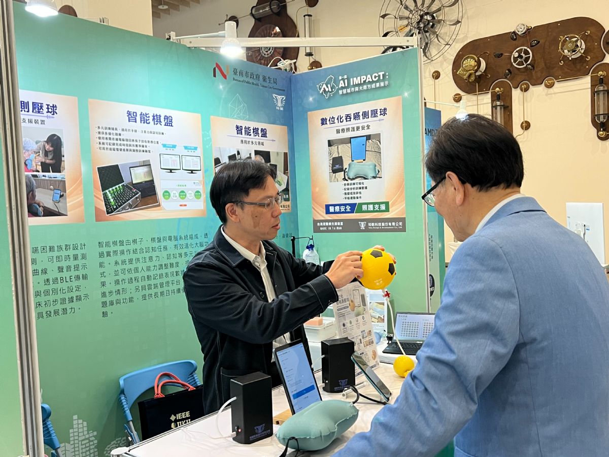 活動現場同時展示臺南市推動多年的咀嚼吞嚥障礙評估與照護服務。臺南是全國率先由地方政府系統性推動吞嚥障礙評估的城市之一,透過社區篩檢、專業評估及復能訓練,協助高齡者維持安全進食能力。本次展會中也展示結合AI回饋訓練設備的吞嚥復能科技,讓民眾現場體驗智慧科技在高齡健康照護中的應用。