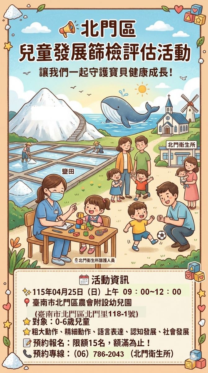 為強化轄區內兒童發展篩檢服務,臺南市北門區衛生所與臺南市北門區農會附設臺南市私立幼兒園共同合作,於母親節前夕115年4月25日上午9時至12時,假北門農會附設幼兒園辦理「兒童發展篩檢外展服務活動」。活動對象針對6個月至6歲幼兒進行全面性發展評估,包括粗細動作、言語表達、認知發展及社會發展等面向,透過專業檢核及早發現發展遲緩跡象,並協助轉介療育資源,以促進兒童健康成長。