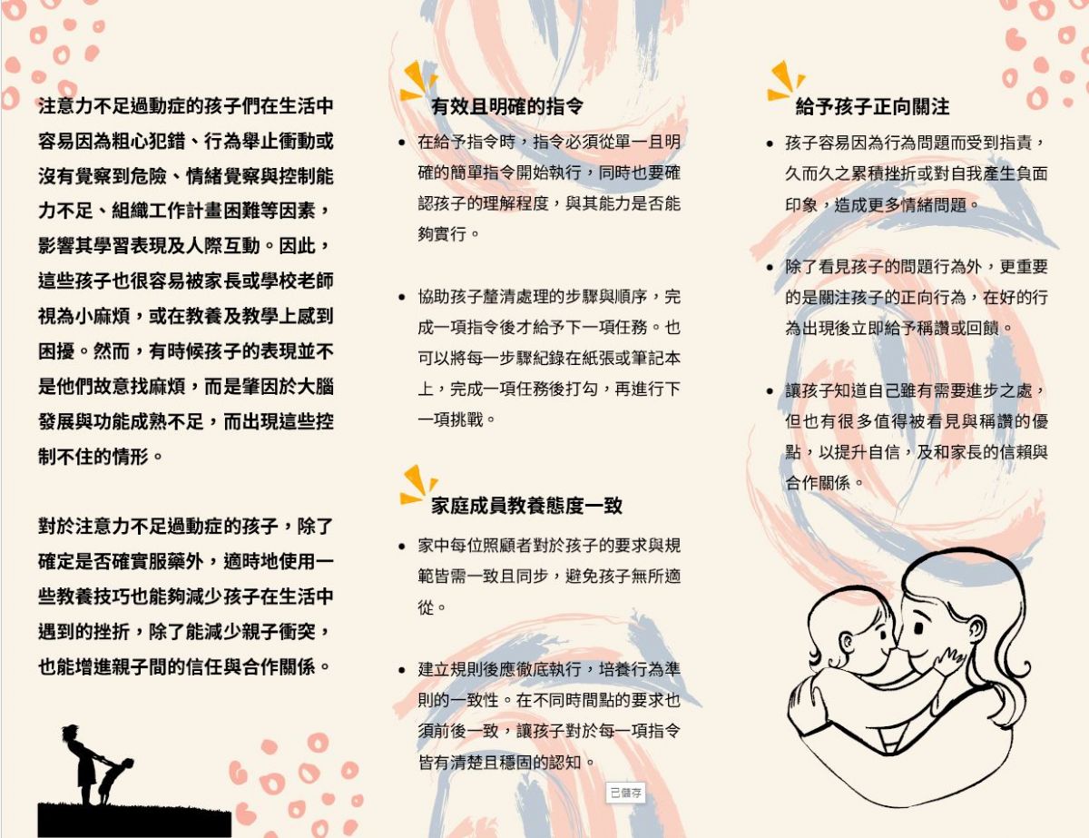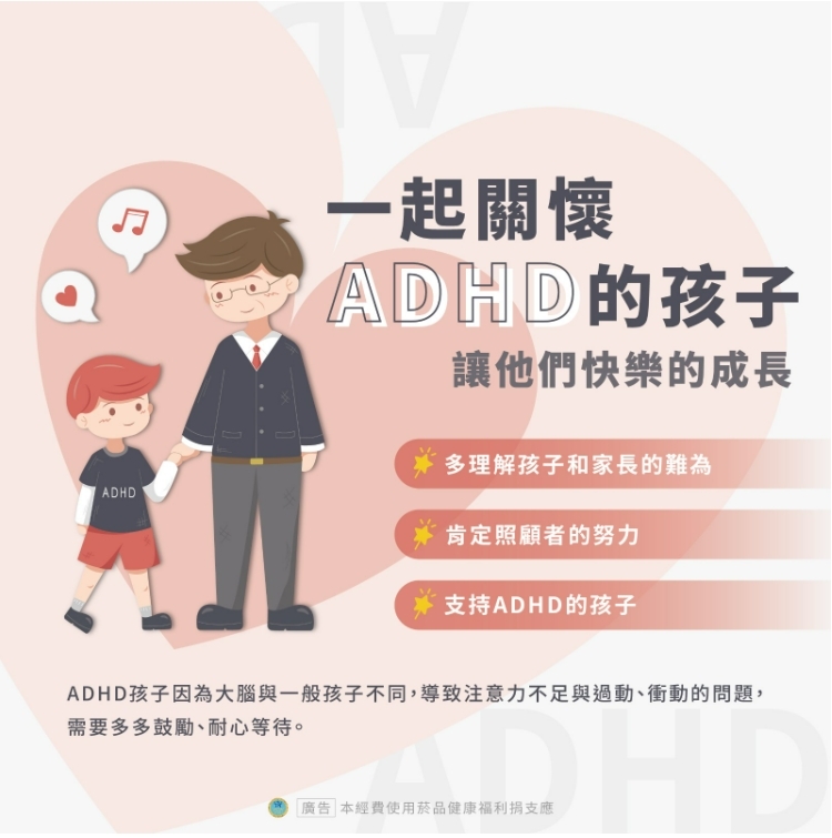 兒童進入國小階段後,注意力不足/過動症(ADHD)特徵常由教師優先發現。ADHD屬神經發展疾患,孩子在生活與學校中可能出現情緒失控、易與他人衝突、破壞公物、不聽從他人指令等問題,甚至被誤標為「壞孩子」,讓教師與父母教育及教養照顧上相當困擾。研究指出,家庭教養方式與ADHD兒童情緒調適有密切相 關,另校園是否能理解ADHD,也是直接影響其自尊、學習動力及人際互動。因此,父母的心理健康及校園打 造友善環境,都是支持兒童發展的重要關鍵。
