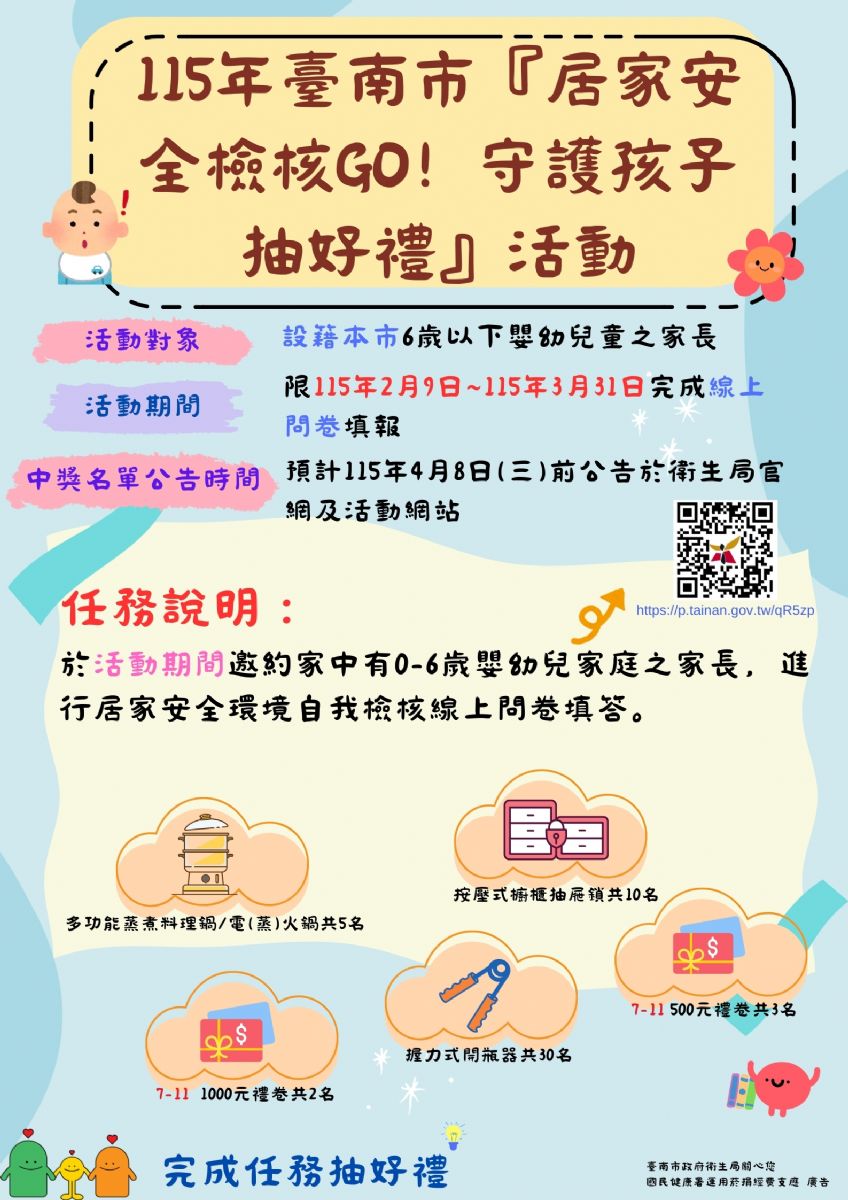 為守護孩子的成長安全,臺南市政府衛生局推出「0-6歲嬰幼兒居家安全守護計畫」,透過線上居家安全環境自我檢核問卷及獎勵活動(活動網址:https://p.tainan.gov.tw/qR5zp ),鼓勵家長主動檢視居家空間潛在危險因子,提升風險辨識與預防能力。自即日起至3月31日止,凡完成線上問卷填答者,即可參加抽獎活動,有機會獲得精美好禮,邀請家長共同響應。