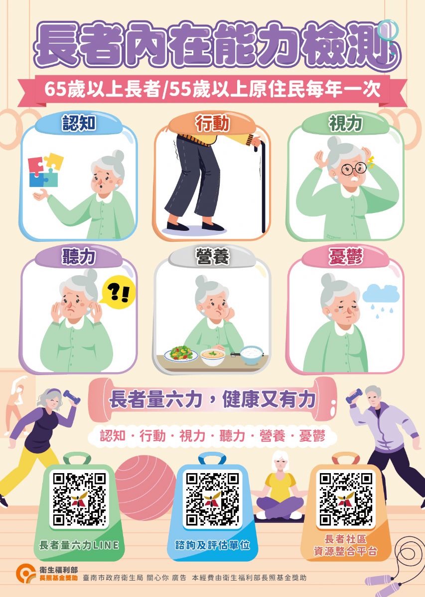 臺南市政府衛生局誠摯邀請市民朋友攜家中長輩一同參與,從了解功能開始,把握黃金介入時機,為健康老化打下最好的基礎。