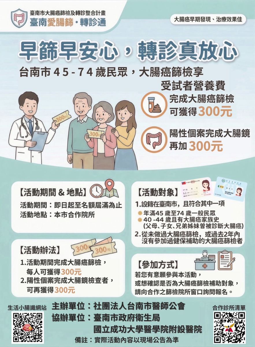 為鼓勵市民積極參與大腸癌篩檢,台南市醫師公會主辦「臺南愛(AI) 腸篩計畫」。本頁面提供以下重要資訊: