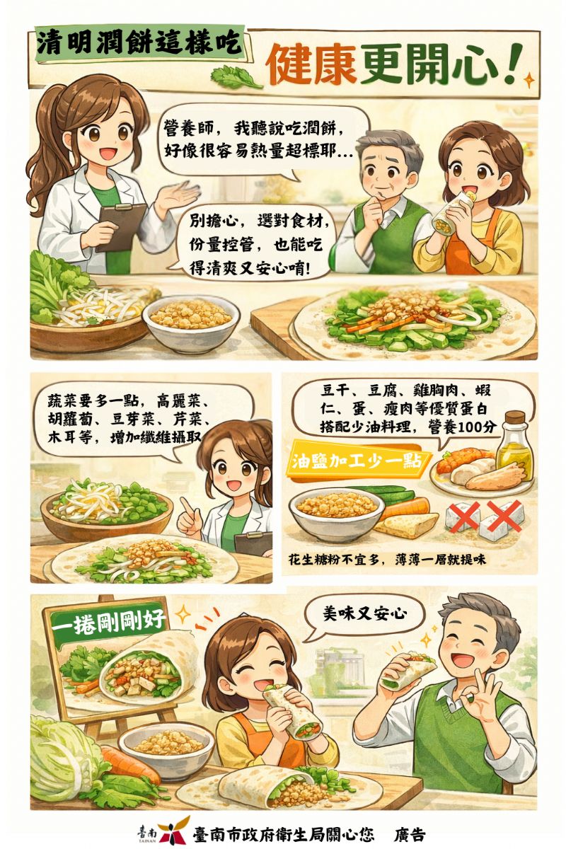 清明節一到,家家戶戶少不了一捲潤餅,薄薄一張餅皮包進滿滿配料,不只是節慶記憶,更承載著團聚的味道。不過,潤餅看似清爽,其實一不小心就可能熱量爆表。臺南市衛生局的營養師提醒大家,潤餅不是不能吃,而是「怎麼吃」很重要,只要稍微調整,就能兼顧美味與健康。