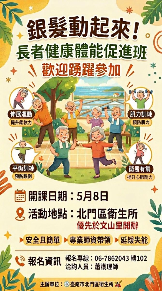 為因應高齡化社會來臨,促進長者健康與延緩失能,北門區衛生所將開辦「長者健康體能促進班」,透過規律且系統化的運動課程,鼓勵在地長者走出家門、培養運動習慣,打造健康、活躍的高齡友善社區。課程預計於5月8日正式開課,由專業師資帶領,內容包含伸展運動、肌力訓練、平衡訓練及簡易有氧活動,並融入防跌倒及慢性病預防等健康知識。課程設計安全、簡單且適合各類長者參與,即使無運動基礎亦可安心加入。