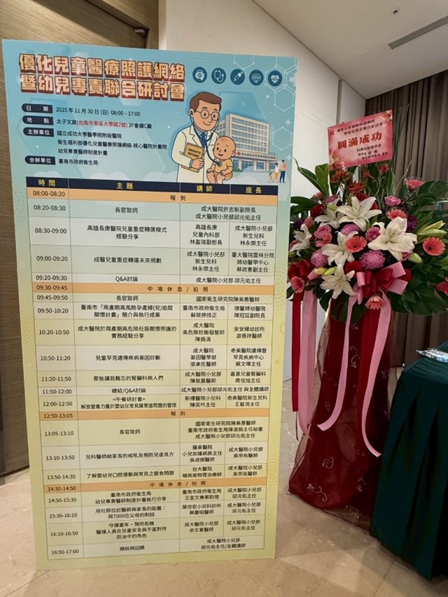 臺南市政府衛生局與國立成功大學醫學院附設醫院(成大醫院)於114年11月30日(星期日)共同舉辦「優化兒童醫療照護網絡暨幼兒專責聯合研討會」。本次研討會旨在延續「第2期優化兒童醫療照護計畫」(114年至117年)強化幼兒專責醫師制度的個案管理及媒合服務,透過跨層級、跨領域的交流,共同建構更為完善的兒童醫療照護體系。