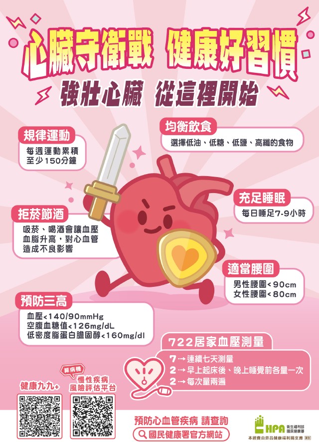 722原則指:連續7天、早晚各量2次、每次測2遍取平均值,以掌握自身血壓狀況;為瞭解自身血壓狀況並減少白袍高血壓的誤差,呼籲18歲以上市民每年應執行一次722在家量血壓,也特別提醒女性朋友們,在更年期這個特殊時期,因為女性荷爾蒙分泌減少,罹患心血管疾病風險及衍生的死亡風險上升,血壓管理更顯重要,如家中無血壓計亦可就近至衛生所或社區中的血壓站進行血壓量測。邀請市民朋友們一起加入健康守門人行列,定期健康檢查與722量血壓,關注自己與家人健康數值與血壓的變化,均衡飲食及規律運動,落實健康生活型態,共同守護你我的健康!