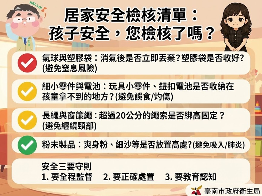 為守護幼兒安全,衛生局也溫馨提醒家長與照顧者落實「安全三要」原則:一、要全程陪伴:孩童玩耍氣球或細小物品時,務必在旁看顧,避免將物品靠近口鼻。