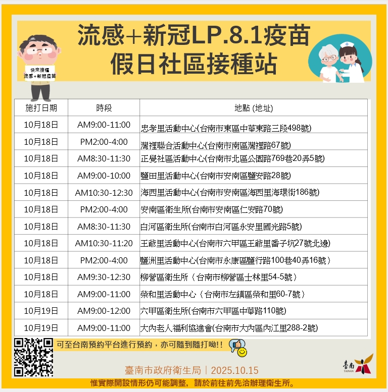 來! 來! 看過來!! 114年臺南市假日新冠及流感疫苗接種站-1017更新