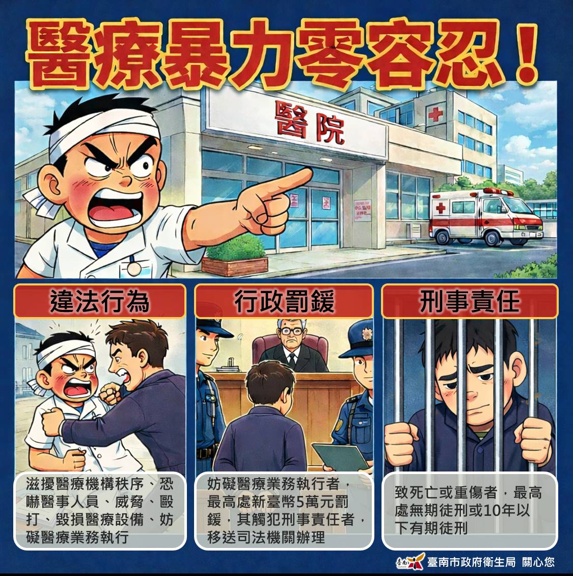 回顧 114 年 4 月,本市某醫院急診室發生一起令人遺憾的醫療暴力事件。一名病患於就醫過程中,僅因不滿護理人員未隨時隨地守候在側,竟當場大聲咆哮,甚至喪失理性徒手毆打正在執行醫療業務的護理人員。此舉導致該名護理同仁身體多處鈍挫傷,更留下了深沉的身心恐懼。事發後,院方立即依規定向衛生局及臺灣臺南地方檢察署通報。