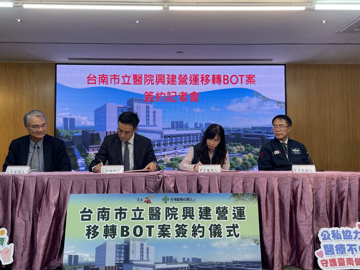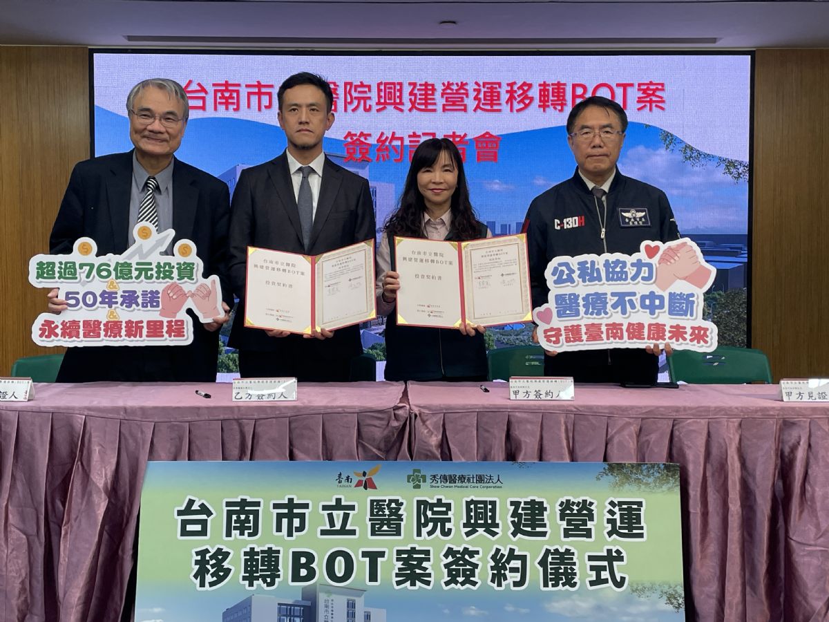 衛生局李翠鳳局長進一步說明,依據台南市立醫院原委託經營ROT契約規定,現有經營投資人得於契約效期屆滿前優先提報投資計畫,秀傳醫療社團法人於112年3月14日主動提出規畫構想書,市府衛生局依據契約、秀傳醫療社團法人所提規畫構想書及《促進民間參與公共建設法》規定,自113年起即啟動政策公告、可行性評估,為了傾聽民意修正規劃藍圖也辦理2場公聽會,邀請民意代表及當地居民充分表達意見等前置作業,於114年9月份開始在本局及財政部網頁公開徵求民間申請人,截至114年11月28日截止收件,並於12月8日召開甄審委員會,經審慎評選後,由秀傳醫療社團法人獲評為最優申請人。雙方隨後於12月22日完成議約,今日正式完成簽約,新BOT契約將於116年7月1日正式生效。新建工程將加入腫瘤大樓的建設,50年營運期間屆滿後,移轉該建設之所有權予臺南市政府。