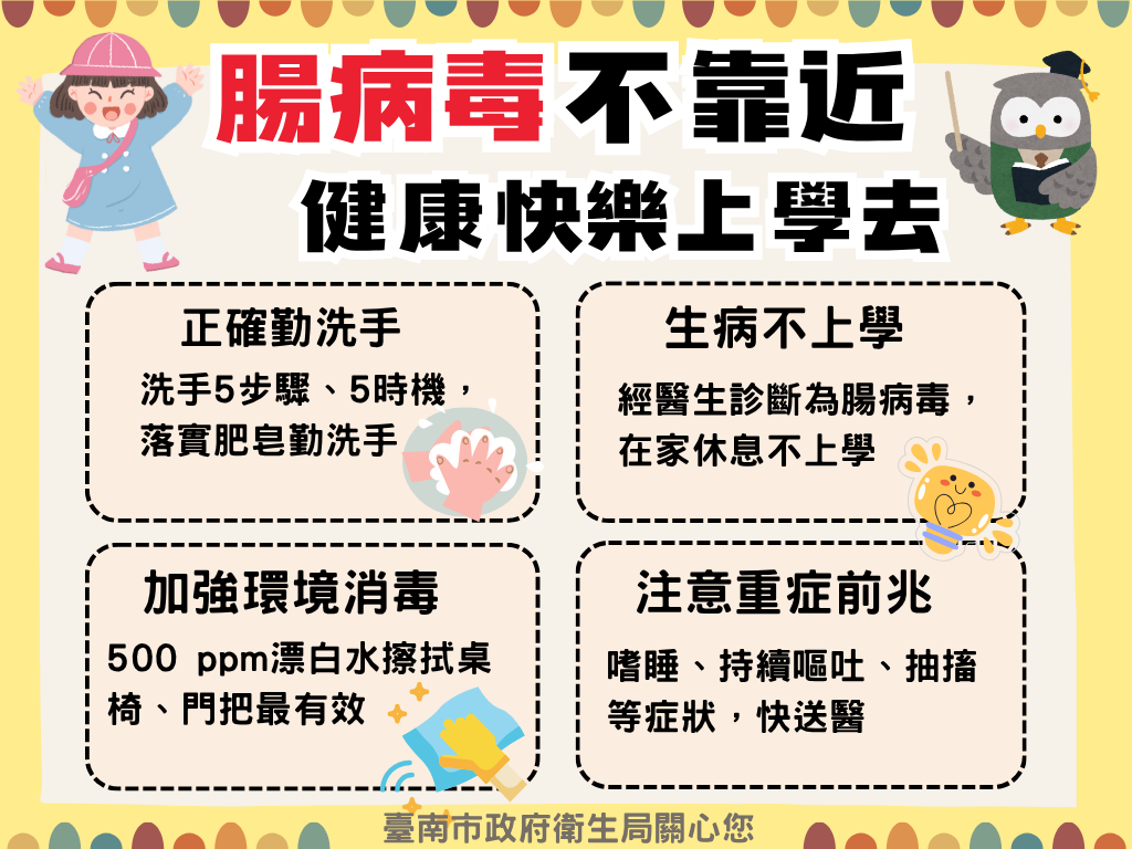 4.注意重症前兆:家長應提高警覺,若幼童出現嗜睡、意識不清、持續嘔吐、手腳無力或肌躍型抽搐等症狀,請立即前往本市五家腸病毒重症責任醫院就診(成大醫院、永康奇美醫院、郭綜合醫院、臺南新樓醫院、麻豆新樓醫院)掌握黃金治療時間。