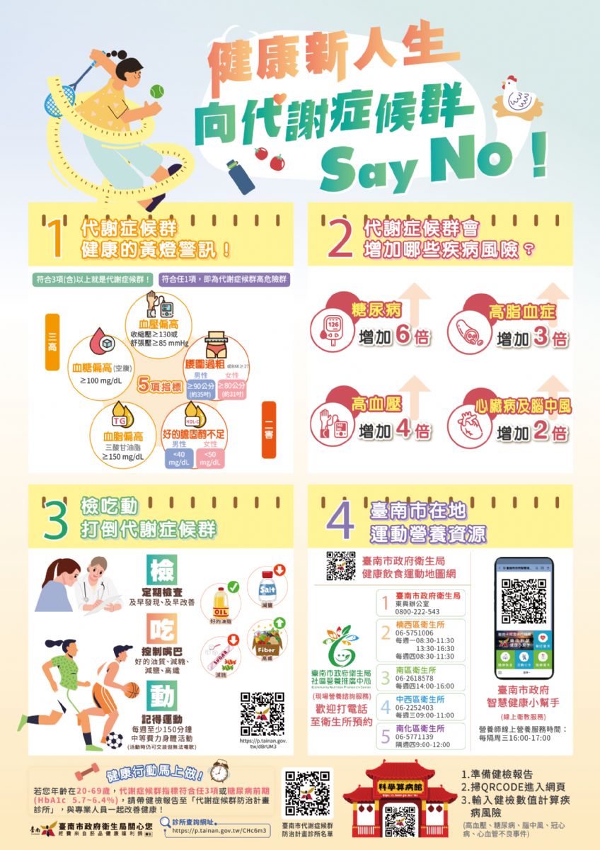 守護女人心,關鍵之一是落實「檢、吃、動」三原則:「 檢」—量腰圍、量血壓、定期健康檢查,掌握血壓、血糖、血脂等關鍵指標;「吃」—減糖、減鹽、高纖、好的油脂原則,維持營養 均衡的健康飲食;「動」—每天累積活動量,快走、爬樓梯、做家 事都算,持續最重要;此外,本市已有365家代謝症候群防治計畫 醫療院所 (網址: https://p.tainan.gov.tw/CHc6m3 )可協助進 行健康管理,一起遠離代謝症候群、守護女性心血管健康。