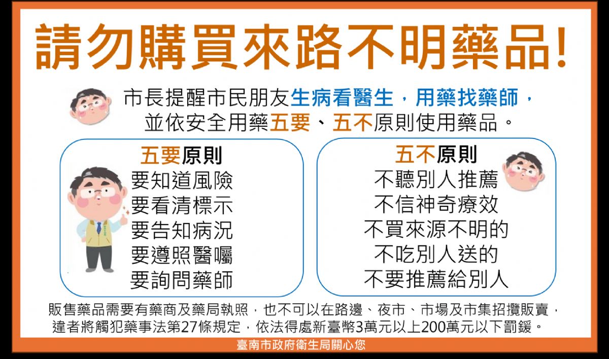 衛生局長李翠鳳提醒市民生病看醫生,用藥找藥師,並遵循專業醫藥人員的指示使用領有我國藥品許可證之藥品才能確保自身的健康和用藥安全。落實安全用藥「五要」、「五不」原則,「五要」原則:要知道風險、要看清標示、要告知病況、要遵照醫囑、要詢問藥師。「五不」原則:不聽別人推薦、不信神奇療效、不買網路、地攤夜市或來源不明的、不吃別人送的、更不要推薦給別人。