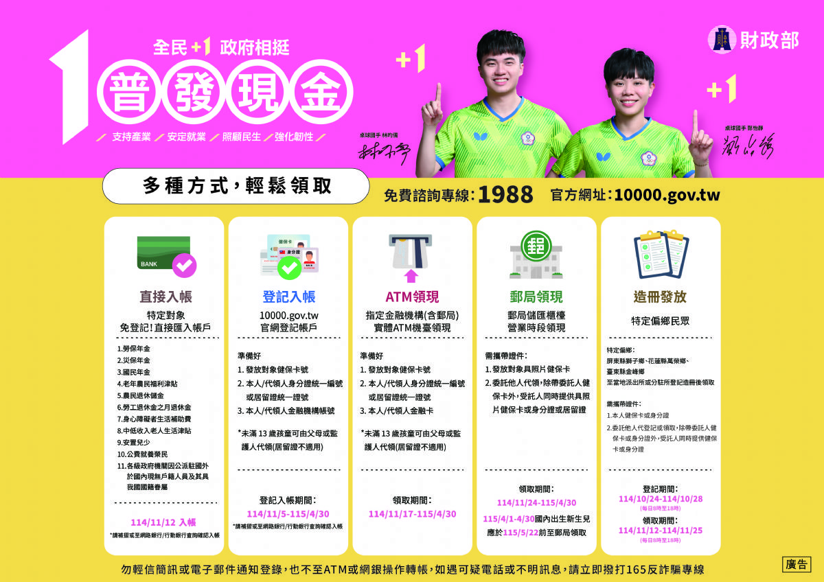 【政策宣導】「全民+1 政府相挺」普發現金領取方式
