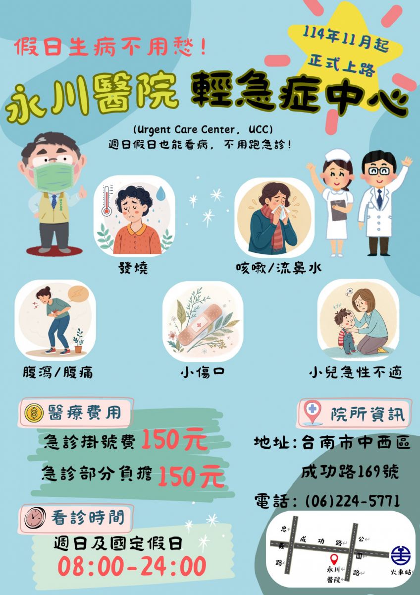永川醫院自今年11月起,週日與國定假日上午8點至晚上12點皆提供服務,需立即就醫之民眾,掛號費僅收150元,就診專線:06-2245771和0978-089-180。