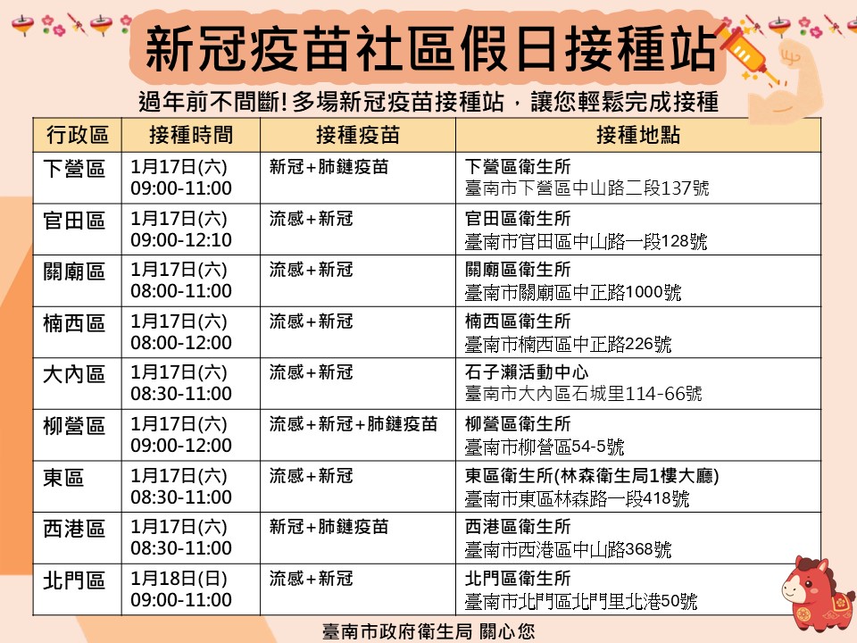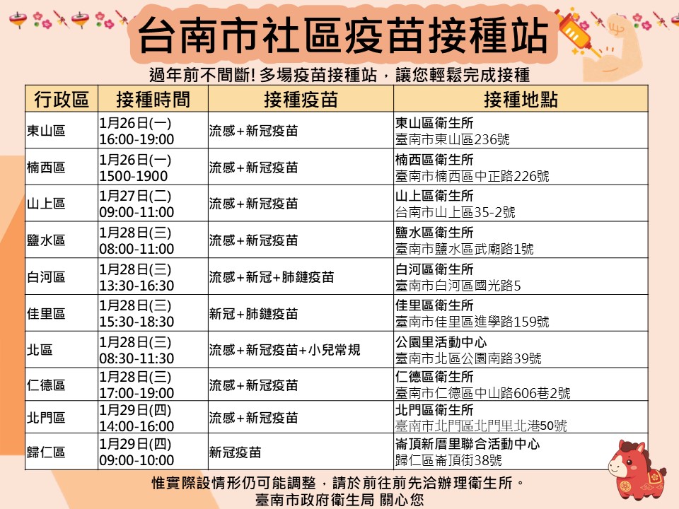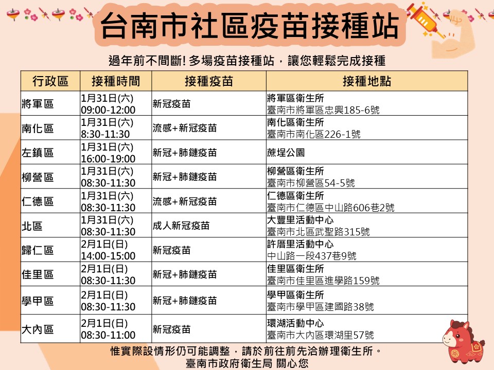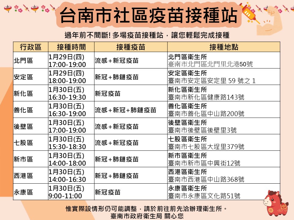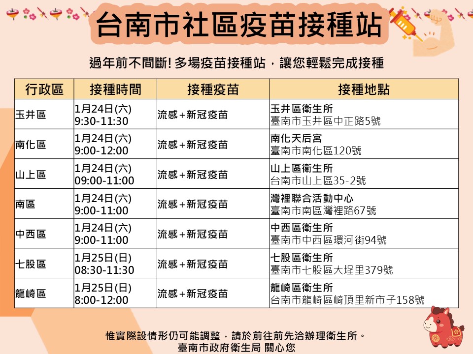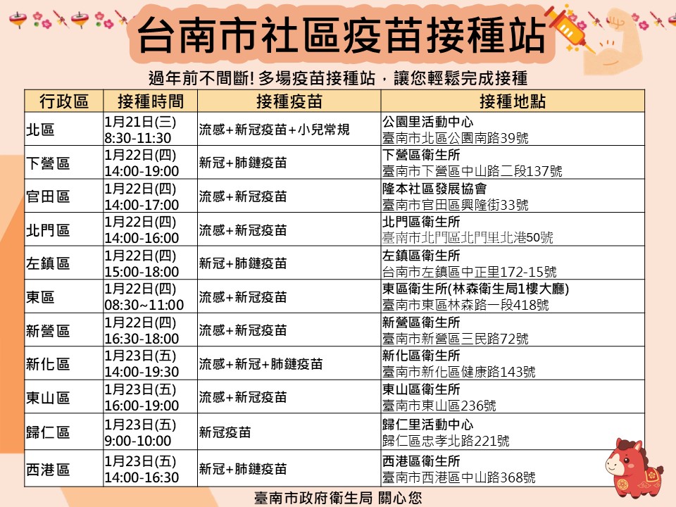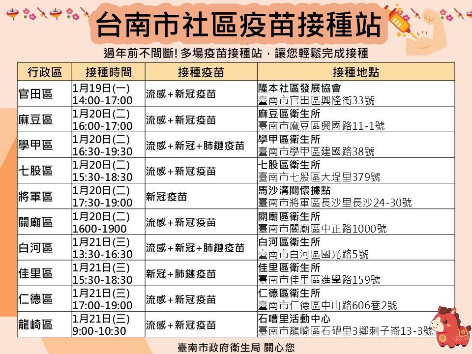 看過來!! 115年1月~2月臺南市流感及新冠疫苗假日及夜診接種站