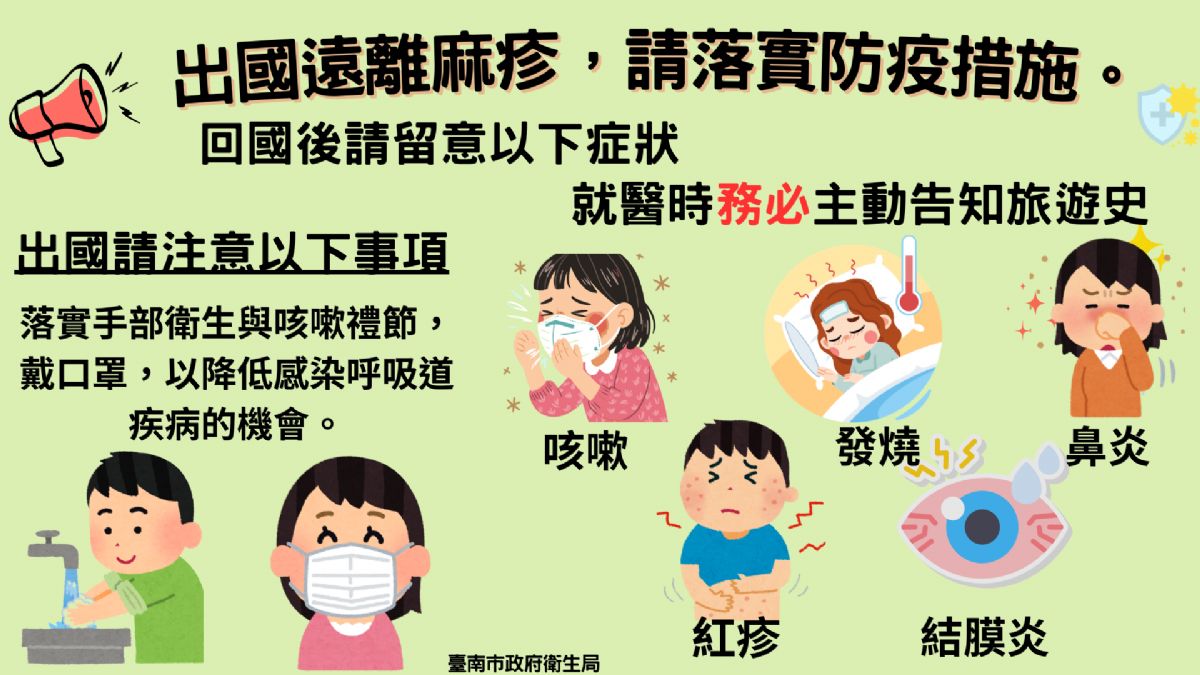 近期因麻疹境外移入個案導致國內接連出現群聚事件,依據衛生福利部疾病管制署資料顯示,我國今(2026)年截至3月4日累計4例麻疹病例,年齡介於未滿1歲至40多歲,其中2例為國內感染病例,另2例為境外移入病例,感染國家分別為越南及馬來西亞;南市雖目前無麻疹確診病例,然該病傳染力強,民眾仍需提高警覺。另本土確診個案於可傳染期間在南投縣活動足跡如下:2月27日中午12點至下午1點半於竹山鎮紫南宮、1點半至2點水里鄉老擔麵店、2點半後入住魚池鄉日月潭涵碧樓、晚間6點至7點半於日月潭涵碧樓東方餐廳用餐 ,請有足跡重疊的民眾落實自主健康管理至3月17日止。全球麻疹疫情仍持續,亞洲地區如馬來西亞、越南、新加坡、日本、印尼、印度、蒙古及哈薩克等國自去(2025)年迄今均持續通報病例,建議民眾如規劃前往上述國家或地區,應落實手部衛生與咳嗽禮節,並於進出人潮擁擠或通風不良場所時建議佩戴口罩,以降低感染風險。
